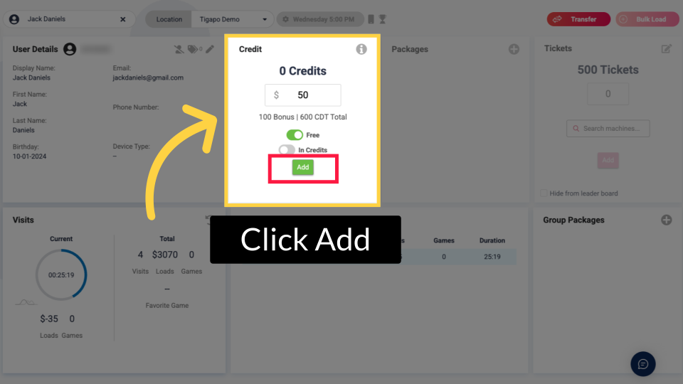 Enter the number of credits to add for this user as highlighted in BLUE.