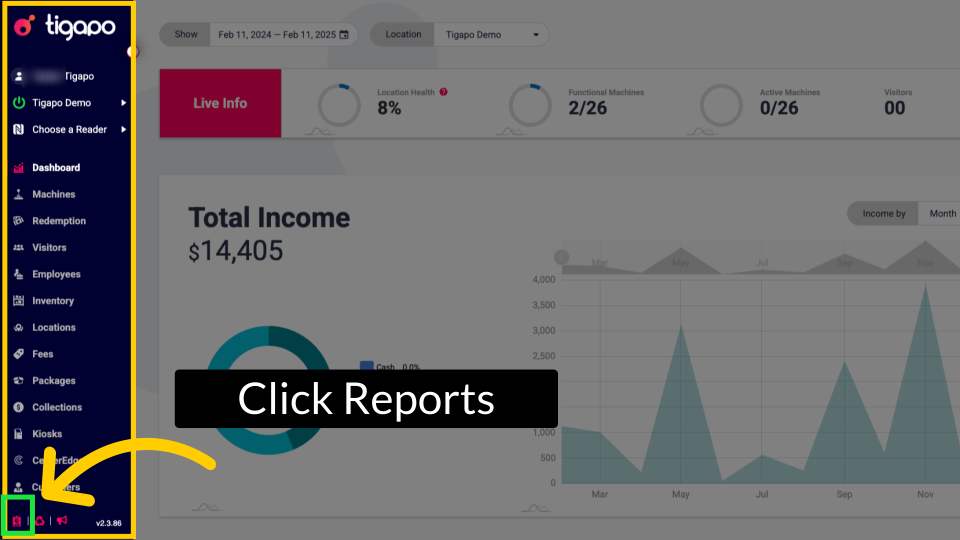 From the tigapo homepage, click the reports wizard Icon in the bottom corner of the side menu as highlighted in GREEN.